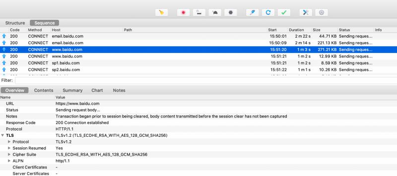 Proxy->Start Recording,打開瀏覽器訪問任意頁面,可以在Charles中看到請求了。