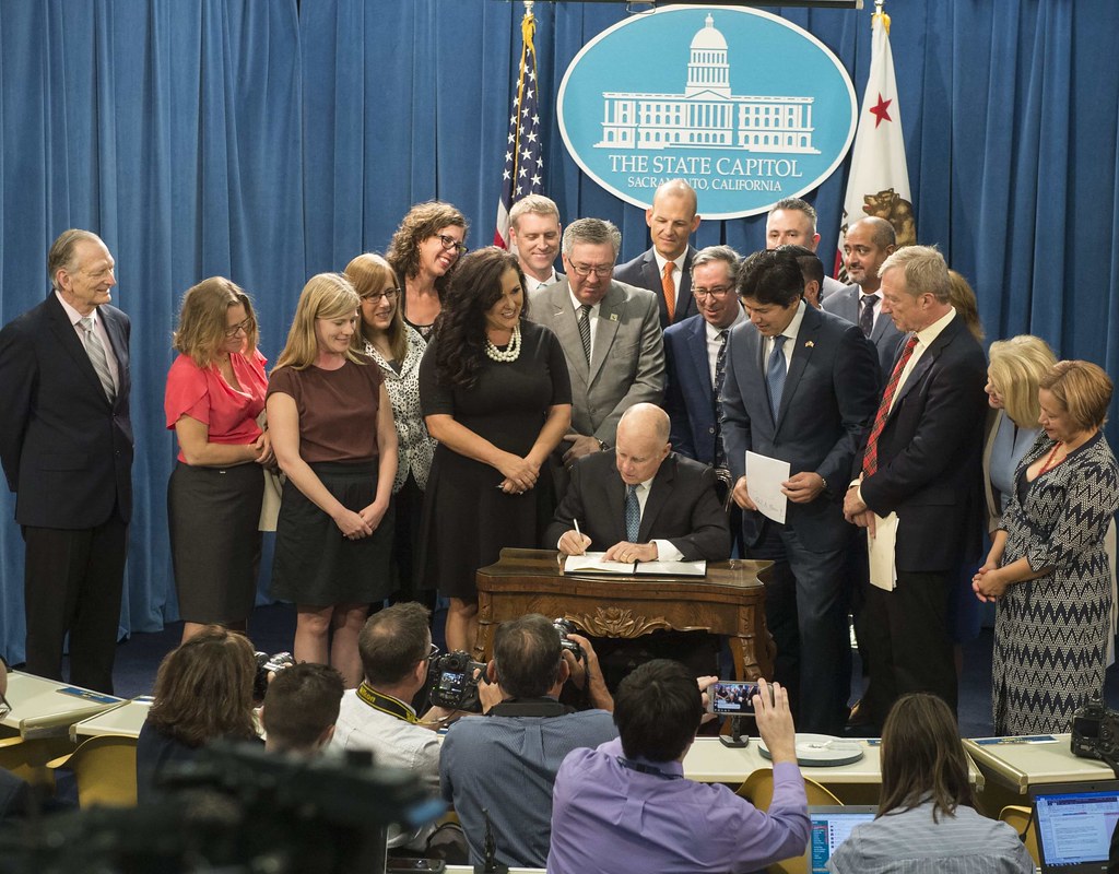加州州長布朗簽署參議院100號法案(SB 100)。圖片來源:Office of the Governor