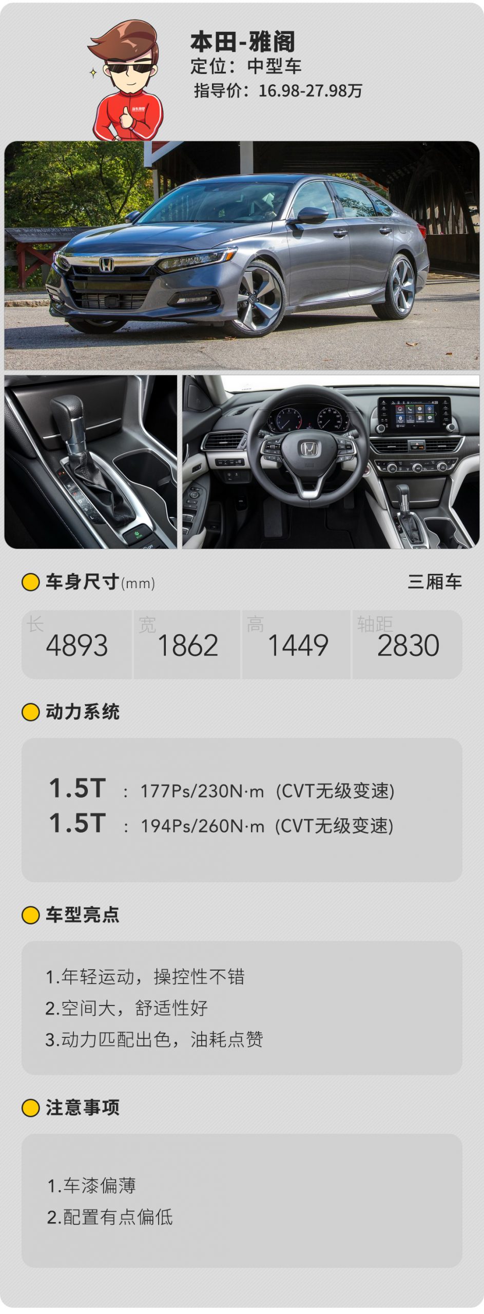 點評:十代雅閣顛覆了其在人們心中的傳統形象,激進的運動氣質,轎跑似的身姿以及加長的車身更顯年輕活力和視覺衝擊力,可是一直令人期待的2.0T+10AT卻並未搭載在新一代雅閣之上,不免令人感到些許失落,但1.5T+CVT無級變速器的動力總成所帶來的7.6秒加速成績以及超強的乘坐舒適感,還是令人很驚艷。而依靠驚為天人的顏值和全面提升的實力,面對更為年輕化的90後市場新生代雅閣也是競爭力十足,至於在售價方面也是十分給力。