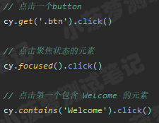 // 單擊某個元素 .click() // 帶參數的單擊 .click(options) // 在某個位置點擊 .click(position) // 在某個位置點擊,且帶參數 .click(position, options) // 根據頁面坐標點擊 .click(x, y) // 根據頁面坐標點擊,且帶參數 .click(x, y, options)
