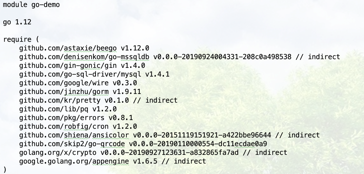 • 在go.mod文件中手動添加依賴類似 github.com/gin-gonic/gin v1.4.0這種。
