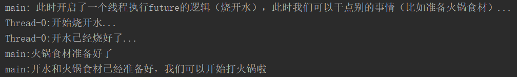 System.out.println(Thread.currentThread().getName() + ":"  + " 此時開啟了一個線程執行future的邏輯(燒開水),此時我們可以干點別的事情(比如準備火鍋食材)...");