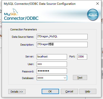 因為ODBC驅動配置已經將數據庫的連接地址、賬號、密碼、數據庫都已經配置完成,連接參數只需要指定驅動名稱即可:DSN=ITDragon_MySQL