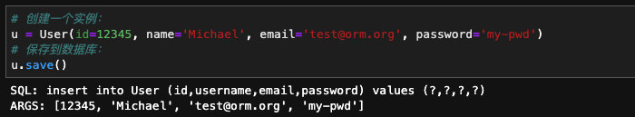 u = User(id=12345, name='Michael', email='test@orm.org', password='my-pwd')